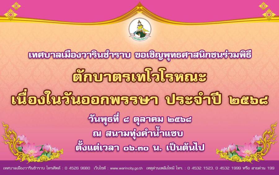 เทศบาลเมืองวารินชำราบ เชิญร่วมทำบุญเสริมความเป็นสิริมงคลในวันออกพรรษา ”ตักบาตรเทโวโรหณะ” 8 ต.ค.นี้