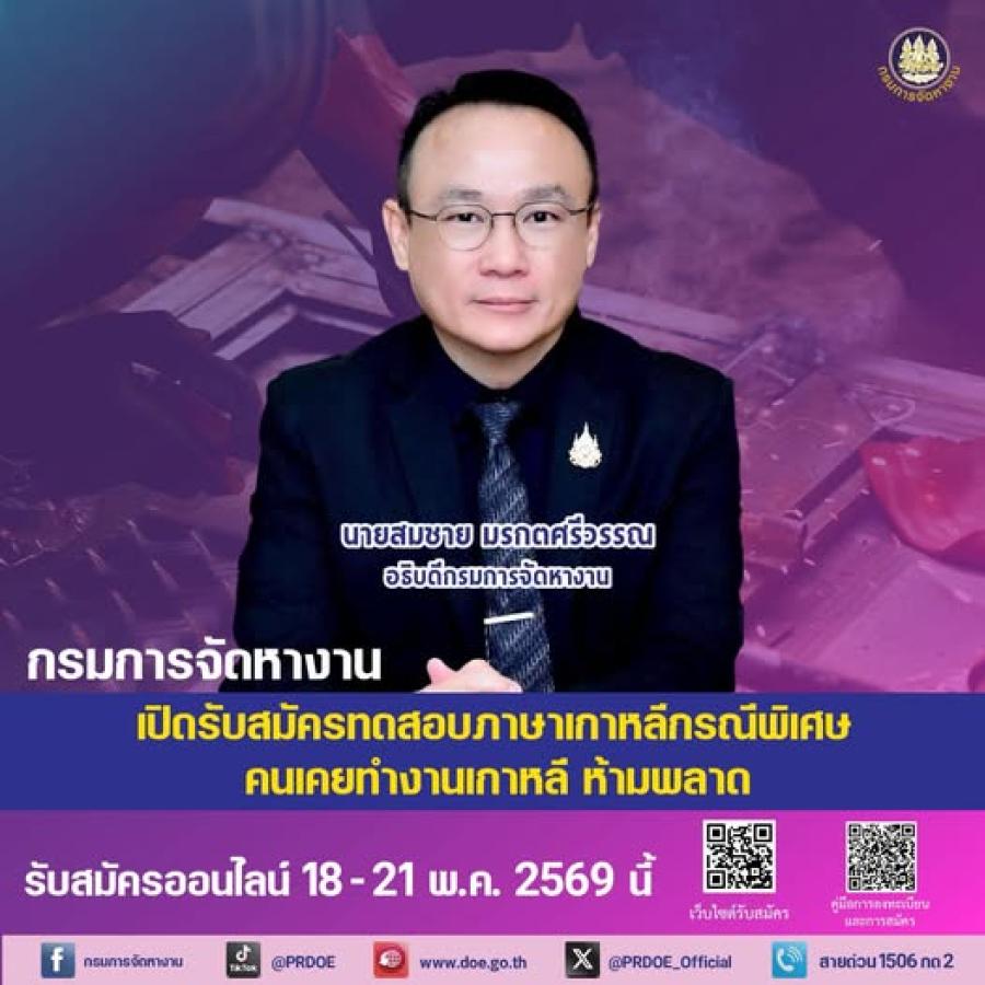 กรมการจัดหางาน เปิดรับสมัครทดสอบภาษาเกาหลีกรณีพิเศษ สมัครผ่านออนไลน์ 18 - 21 พ.ค. นี้