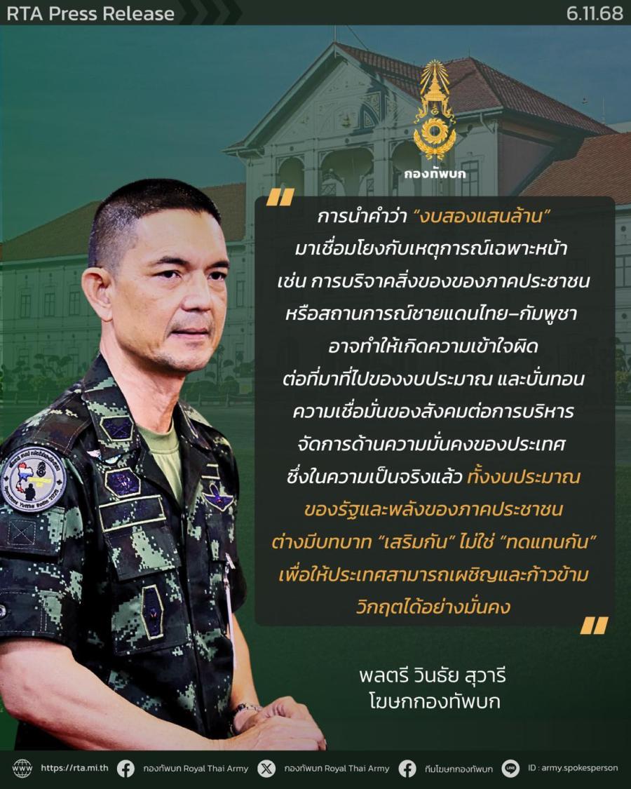 กองทัพบกชี้ “งบสองแสนล้าน” ถูกนำไปเชื่อมโยงกับสถานการณ์ชายแดนเป็นความเข้าใจที่คลาดเคลื่อน ย้ำงบประมาณของหน่วยงานโปร่งใส ตรวจสอบได้