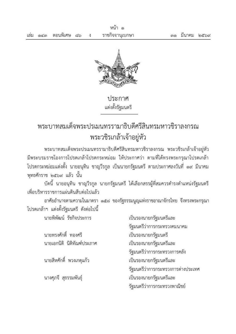 พระบรมราชโองการ ประกาศ แต่งตั้งรัฐมนตรี (รัฐบาลนายอนุทิน ชาญวีรกูล)