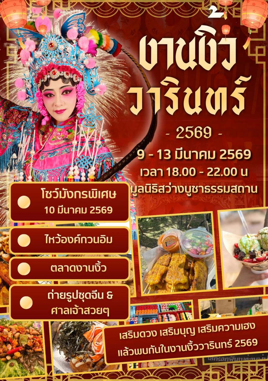 ขอเชิญเที่ยวชม “งานงิ้ววารินชำราบ ประจำปี 2569” เสริมดวง เสริมบุญ เสริมความเฮง 9-13 มี.ค.นี้ ณ มูลนิธิสว่างบูชาธรรมสถาน