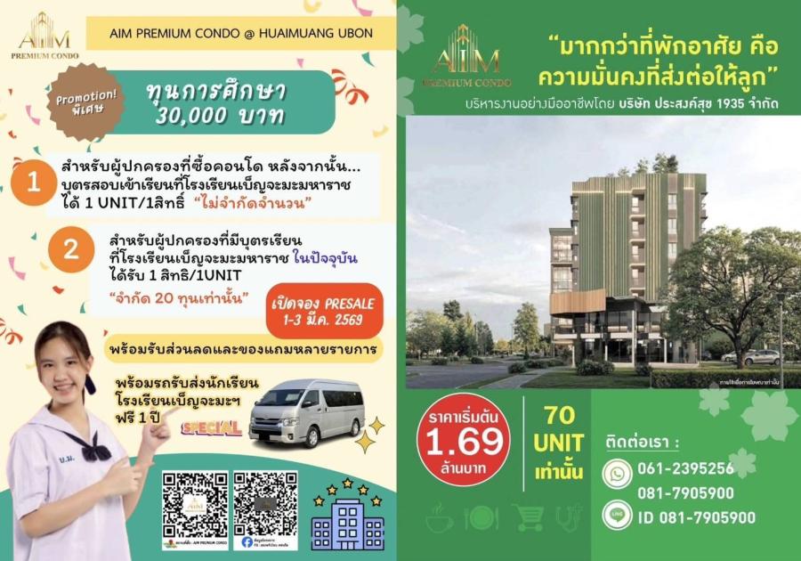”AIM PREMIUM CONDO” คอนโดหรูในอุบลฯ พร้อมเข้าอยู่ต้นปี 70 สาธารณูปโภคเพียบ เพียง 70 unit มีให้เลือกมากถึง 5 ชุด เริ่มต้นที่ 1.69 ลบ.