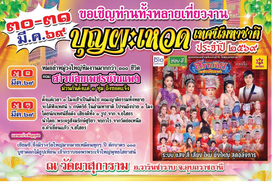 ขอเชิญร่วมงาน ”บุญผะเหวด 2569” 30-31 มี.ค. นี้ ณ วัดผาสุการาม อ.วารินชำราบ จ.อุบลราชธานี
