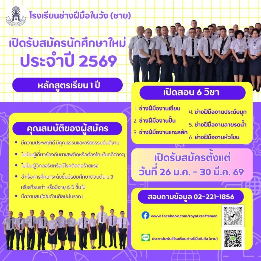 สำนักพระราชวัง เปิดรับสมัครนักศึกษาใหม่โรงเรียนช่างฝีมือในวัง (ชาย) ประจำปีการศึกษา ๒๕๖๙ ตั้งแต่วันที่ ๒๖ ม.ค. – ๓๐ มี.ค. ๒๕๖๙