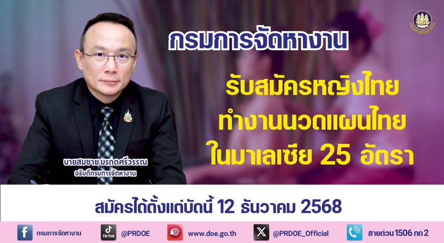 กรมการจัดหางาน เปิดรับสมัครหญิงไทย 25 อัตรา ทำงานนวดแผนไทยในมาเลเซีย หนุน“คนไทยต้องมีงานทำ”