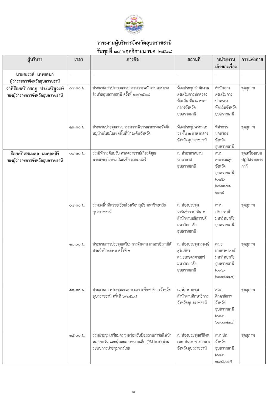 วาระงานผู้บริหารจังหวัดอุบลราชธานี วันพุธที่ 19 พฤศจิกายน 2568