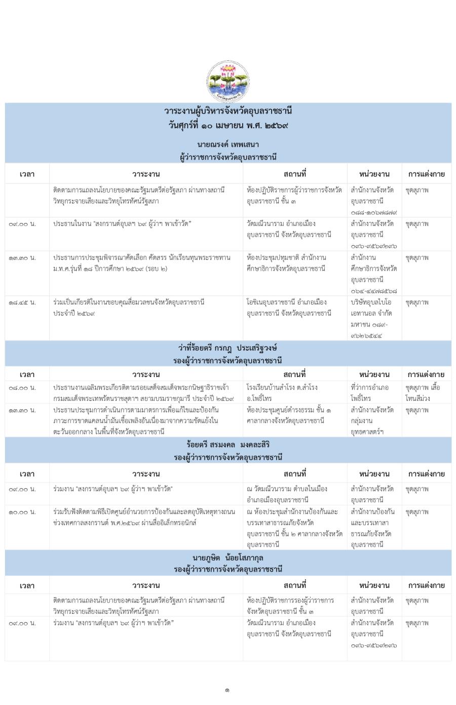 วาระผู้บริหารจังหวัดอุบลราชธานี ประจำวันศุกร์ที่ 10 เมษายน 2569