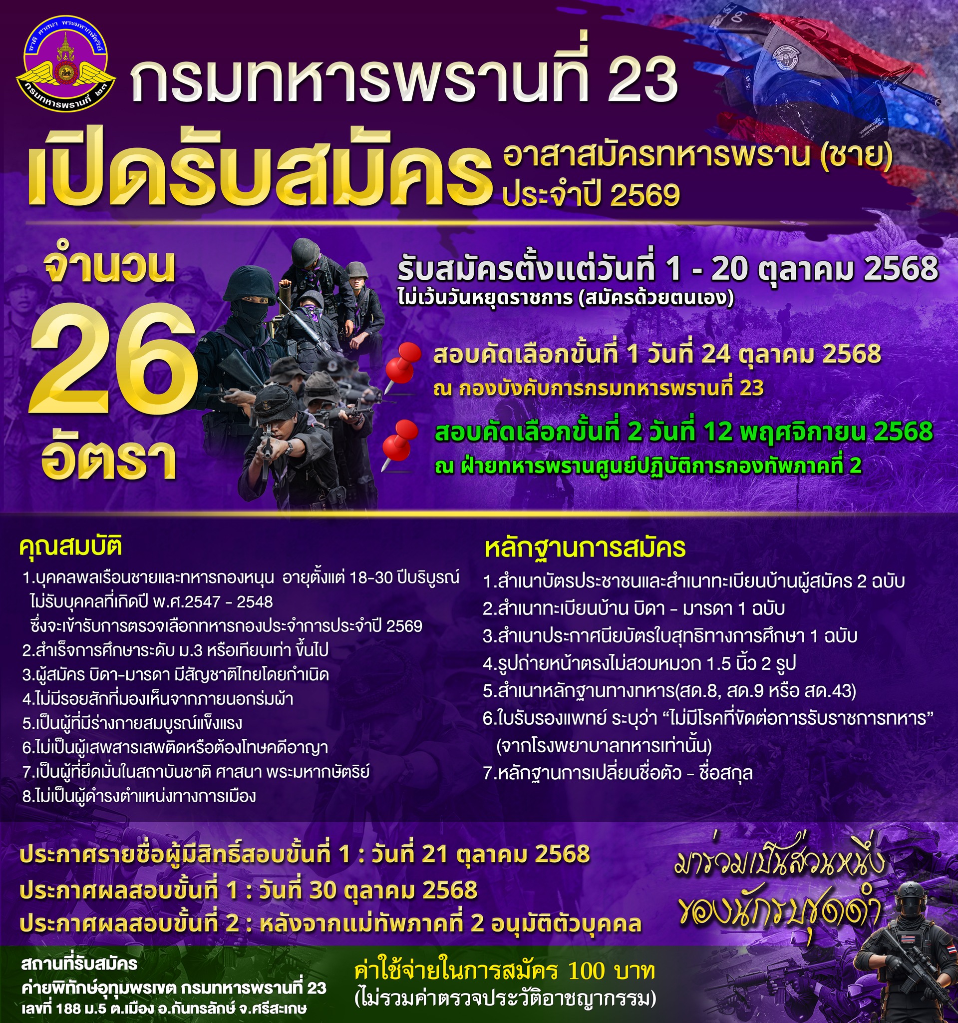 เปิดรับสมัครแล้ว!!! อาสาสมัครทหารพรานชาย กรมทหารพรานที่ 23 ประจำปี 2569