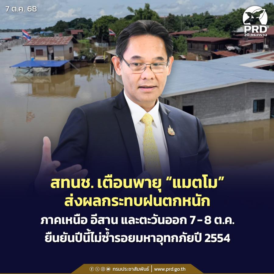 นายดนุชา พิชยนันท์ เลขาธิการสำนักงานทรัพยากรน้ำแห่งชาติ (สทนช.) เปิดเผยภายหลังการประชุมติดตามสถานการณ์น้ำว่า ประเทศไทยยังต้องเฝ้าระวังฝนตกหนักในช่วงวันที่ 7–8 ตุลาคมนี้ จากอิทธิพลของพายุ “แมตโม” ซึ่งอาจส่งผลให้มีฝนตกปานกลางถึงหนักในภาคเหนือ ภาคตะวันออกเฉียงเหนือ และภาคตะวันออก