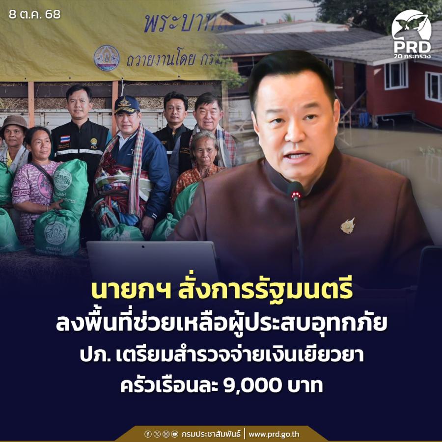 นายกฯ สั่งการรัฐมนตรีลงพื้นที่ช่วยเหลือผู้ประสบอุทกภัย ปภ. เตรียมสำรวจจ่ายเงินเยียวยาครัวเรือนละ 9,000 บาท