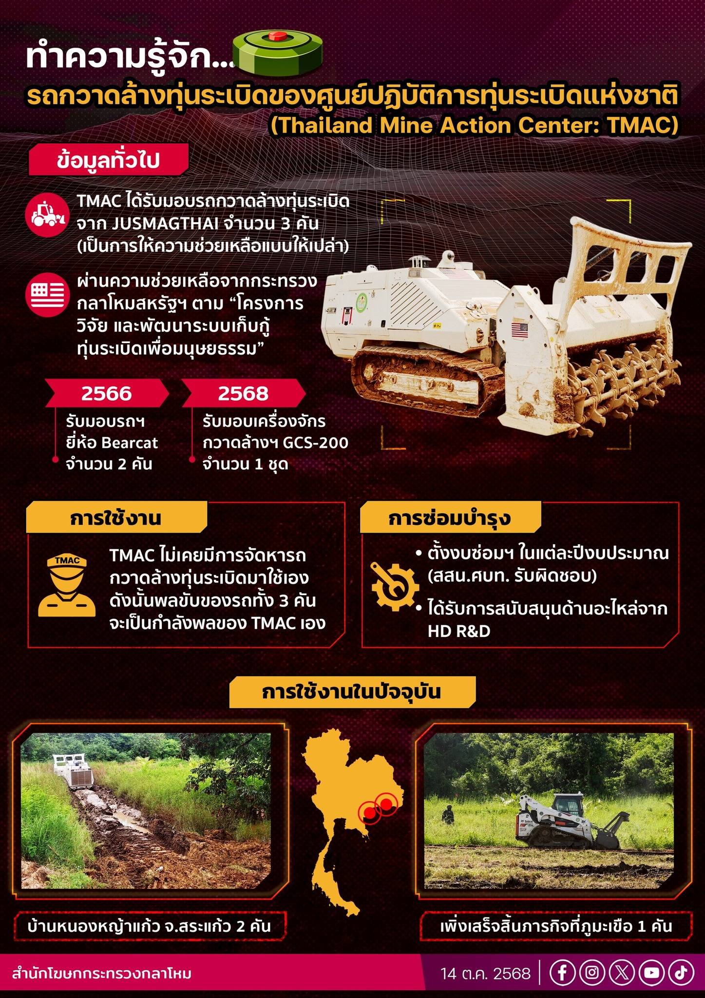 TMAC ได้รับมอบรถกวาดล้างทุ่นระเบิดจาก JUSMAGTHAI จำนวน 3 คัน (เป็นการให้ความช่วยเหลือแบบให้เปล่า) ผ่านความช่วยเหลือจาก กห.สหรัฐฯ ตาม ”โครงการวิจัยและพัฒนาระบบเก็บกู้ทุ่นระเบิดเพื่อมนุษยธรรม (Humanitarian Demining Research and Development Program: HD R&D)” ประกอบด้วย