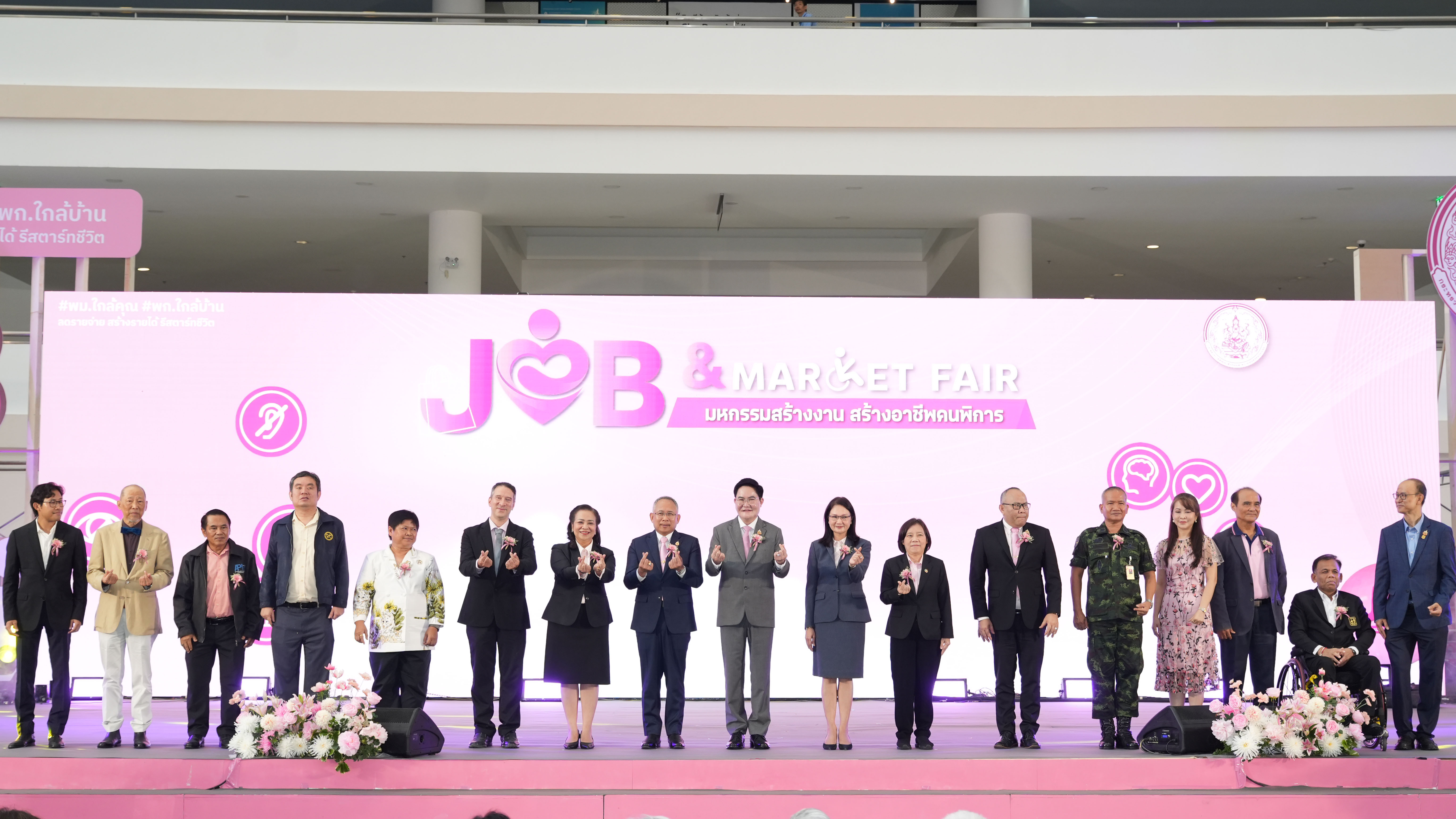 วันที่ 20 ตุลาคม 2568 นายอัครา พรหมเผ่า รัฐมนตรีว่าการกระทรวงการพัฒนาสังคมและความมั่นคงของมนุษย์ (รมว.พม.) เป็นประธานเปิดโครงการ Job and Market Fair : “มหกรรมสร้างงาน สร้างอาชีพคนพิการ” เพื่อส่งเสริมศักยภาพและสร้างโอกาสให้คนพิการมีอาชีพที่มั่นคงและยั่งยืน ด้วยการมุ่งเน้นการพัฒนาทักษะอาชีพและทักษะดิจิทัล ด้วยการเปิดพื้นที่จำหน่ายผลิตภัณฑ์สินค้า และบริการ เชื่อมโยงกับสถานประกอบการเพื่อการจ้างงานคนพิการ โดยนางสาวสนธยา บุณยภูษิต อธิบดีกรมส่งเสริมและพัฒนาคุณภาพชีวิตคนพิการ (อธิบดี พก.) กล่าวรายงาน ซึ่งมี นายกันตพงศ์ รังษีสว่าง ปลัดกระทรวงการพัฒนาสังคมและความมั่นคงของมนุษย์ (ปลัด พม.) คณะผู้บริหารกระทรวง พม. คนพิการพร้อมครอบครัวคนพิการ และผู้ดูแลคนพิการ อาสาสมัคร เครือข่ายคนพิการทั้งภาครัฐ ธุรกิจเอกชน และประชาสังคม รวมถึงสื่อมวลชนเข้าร่วมงาน รวมทั้งสิ้น จำนวน 5,000 คน ณ อาคารรัฐประศาสนภักดี (อาคาร B) ศูนย์ราชการเฉลิมพระเกียรติ 80 พรรษา กรุงเทพมหานคร