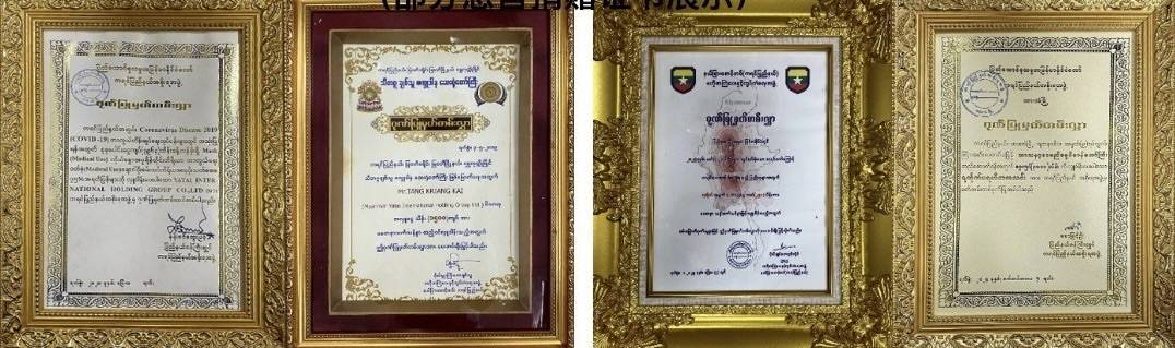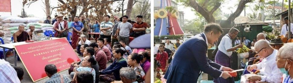 ภาพซ้าย: ปีพ.ศ. 2560 บริจาคเงินช่วยเหลือประชาชนในเขตภัยพิบัติประเทศเมียนมาร์เป็นจำนวน 20000000 จ๊าดเมียนมาร์