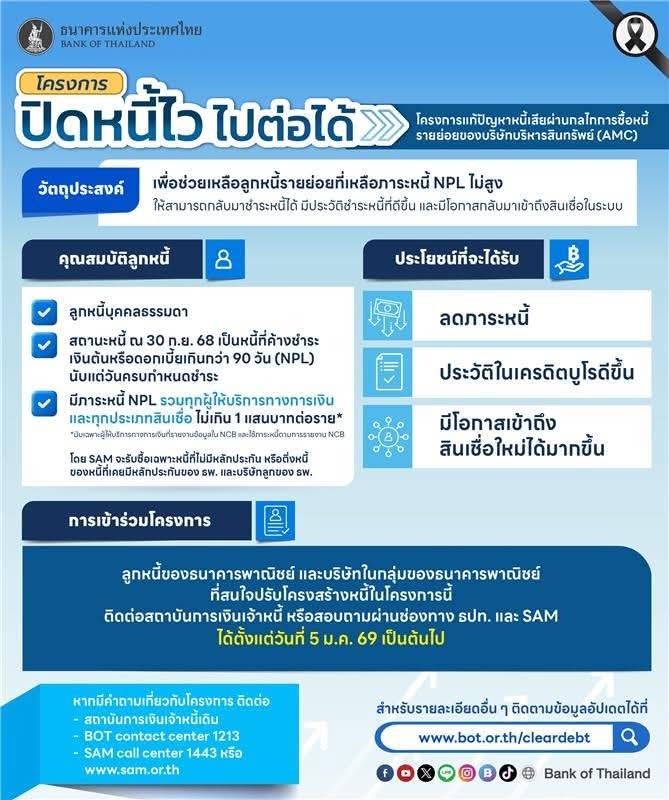 โครงการ ‘ปิดหนี้ไว ไปต่อได้’ กลุ่มเป้าหมายคือลูกหนี้รายย่อยที่มีภาระหนี้ที่ไม่ก่อให้เกิดรายได้ (NPLs) ทุกประเภทสินเชื่อกับผู้ให้บริการทางการเงินทุกแห่งรวมกันไม่เกิน 100,000 บาทต่อราย ณ วันที่ 30 กันยายน 2568 ลูกหนี้ที่เข้าร่วมโครงการ ฯ จะได้รับการปรับโครงสร้างหนี้แบบผ่อนปรนมากกว่าปกติ เพื่อลดภาระหนี้ เช่น ยกเว้นดอกเบี้ยคงค้างทั้งหมดและค่าธรรมเนียม ลดยอดเงินต้นบางส่วน เป็นต้น ทำให้ลูกหนี้สามารถกลับมาจ่ายชำระได้และปิดจบหนี้ได้เร็วขึ้น รวมทั้งกลับมามีประวัติการชำระหนี้ใน NCB ที่ดีขึ้นและมีโอกาสเข้าถึงสินเชื่อในระบบได้อีกครั้ง โดยมี 2 มาตรการ ได้แก่ (1) จ่ายปิดจบ ให้ลูกหนี้จ่ายชำระหนี้บางส่วนเพื่อปิดจบหนี้ในทันที และ (2) ผ่อนชำระหนี้เป็นงวดให้ลูกหนี้ผ่อนชำระเป็นระยะเวลาสูงสุดถึง 3 ปี และจะได้รับการยกเว้นดอกเบี้ยเงินกู้ในระหว่างที่เข้าร่วมมาตรการ หากปฏิบัติได้ตามเงื่อนไข