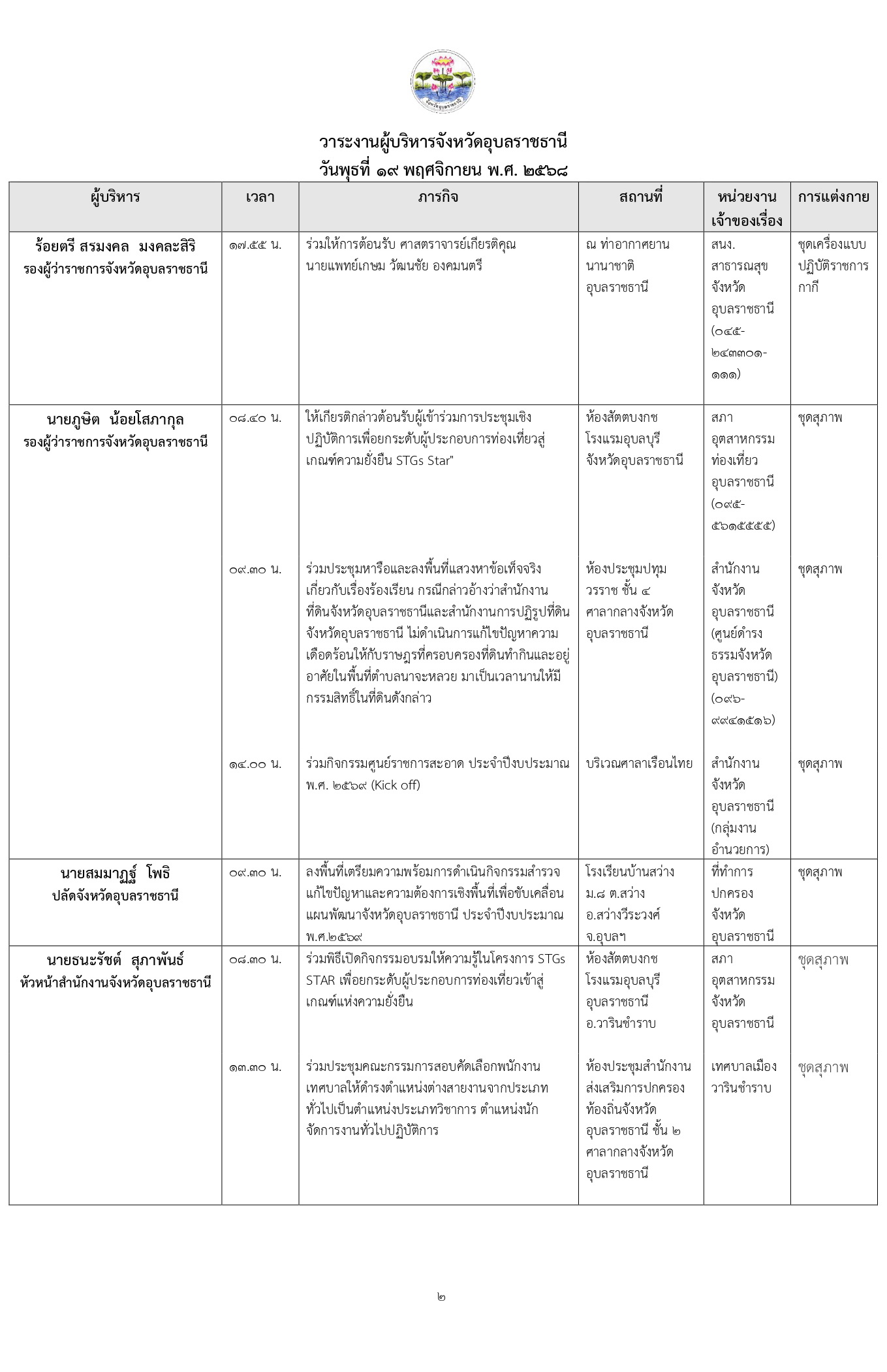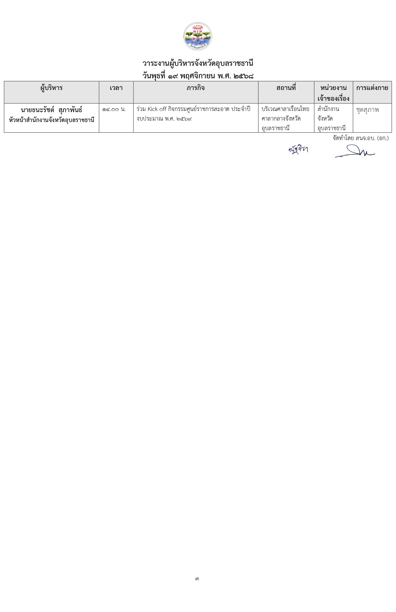 วาระงานผู้บริหารจังหวัดอุบลราชธานี วันพุธที่ 19 พฤศจิกายน 2568