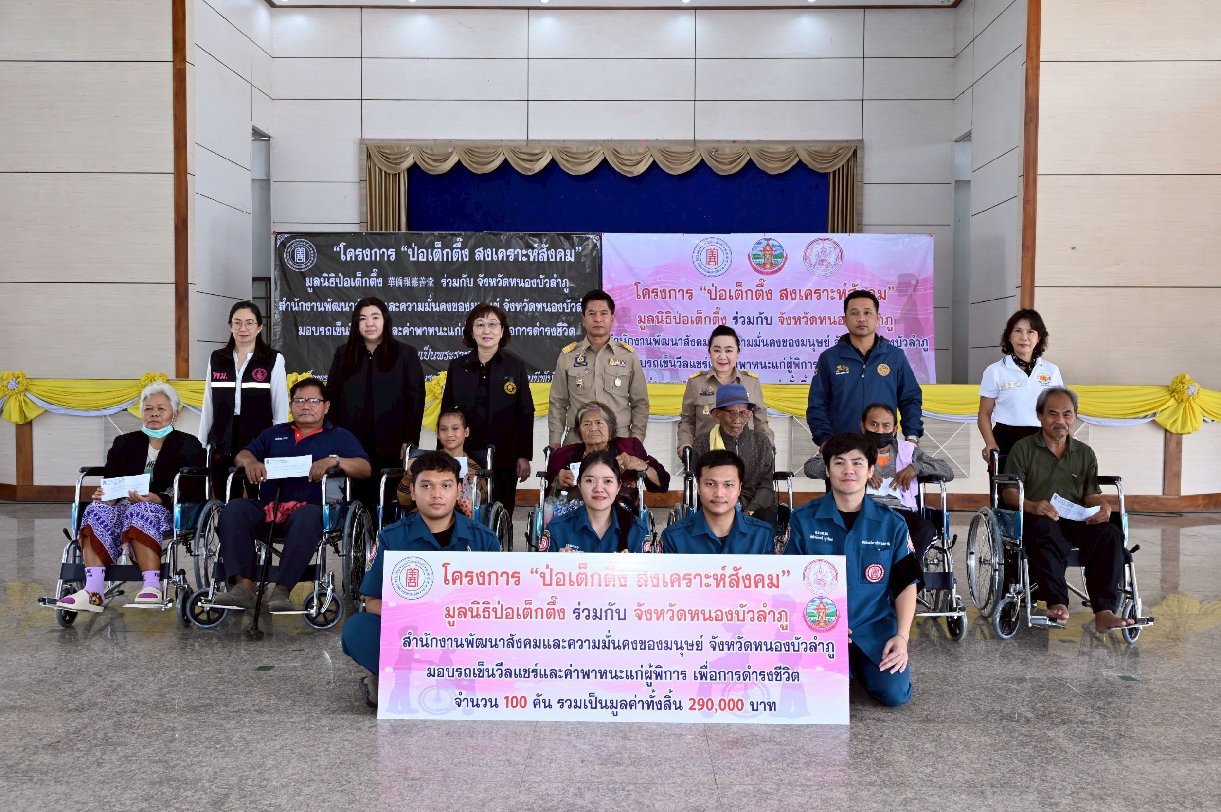 มูลนิธิป่อเต็กตึ๊ง ขยายความช่วยเหลือผู้พิการด้อยโอกาส มอบรถเข็นวีลแชร์พร้อมค่าพาหนะแก่ผู้พิการ 100 คน ในพื้นที่จังหวัดหนองบัวลำภู เพื่อถวายเป็นพระราชกุศลแด่สมเด็จพระนางเจ้าสิริกิติ์ พระบรมราชินีนาถ พระบรมราชชนนีพันปีหลวง ณ ที่ว่าการอำเภอเมืองหนองบัวลำภู อำเภอเมือง จังหวัดหนองบัวลำภู