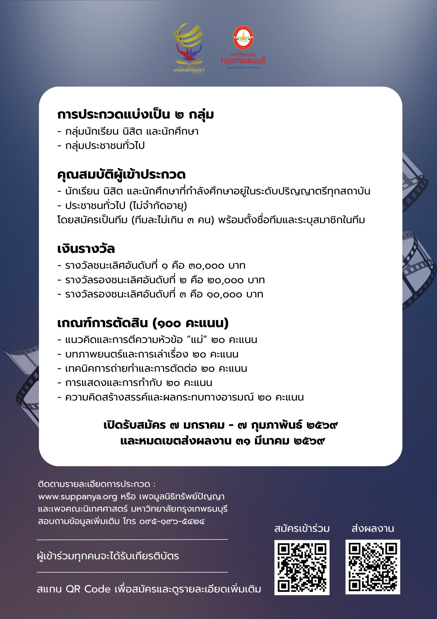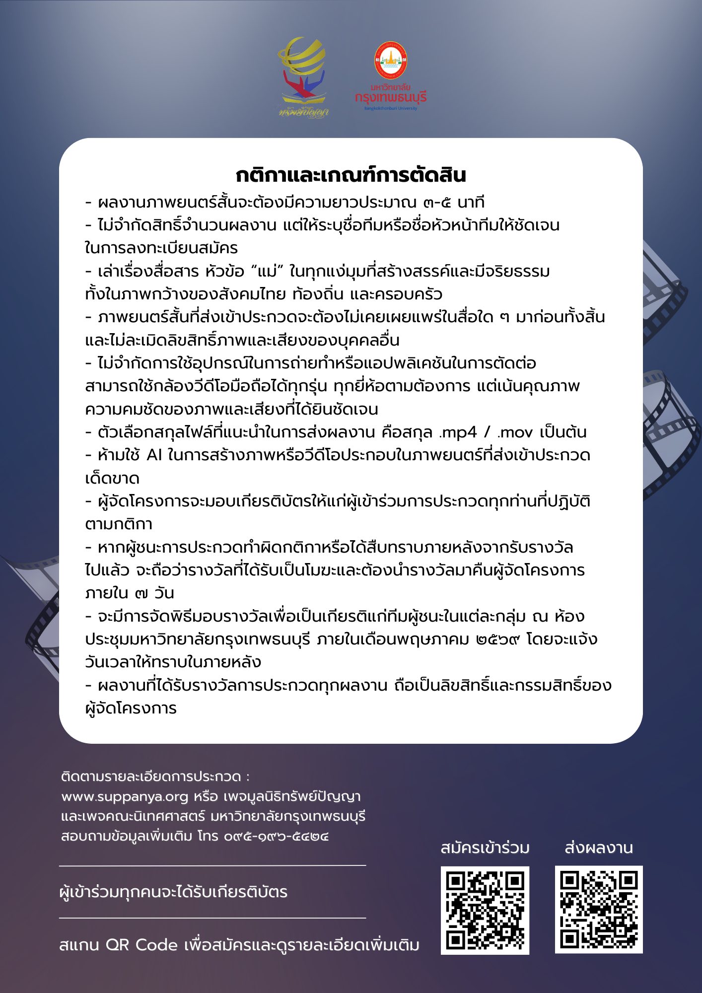 ขอเชิญนักเรียน นิสิต นักศึกษา และประชาชนทั่วไปเข้าร่วมประกวดภาพยนตร์สั้น เรื่อง “แม่” ความยาว 3-5 นาที ชิงเงินรางวัลรวมมูลค่า 120,000 บ.