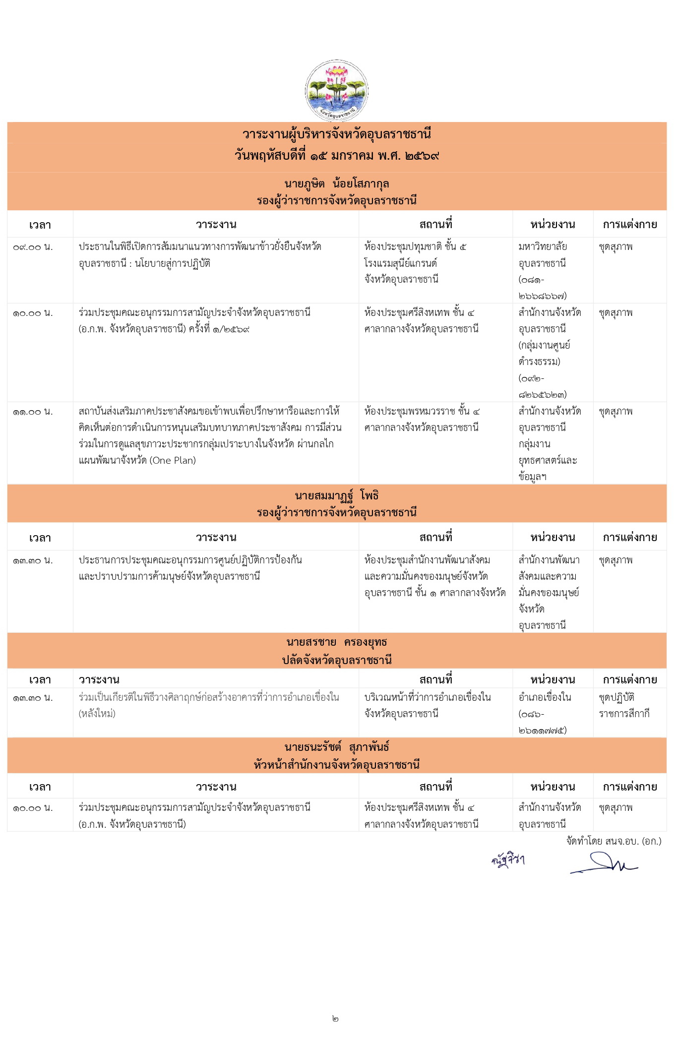 วาระงานผู้บริหารจังหวัดอุบลราชธานี วันพฤหัสบดีที่ 15 มกราคม 2569