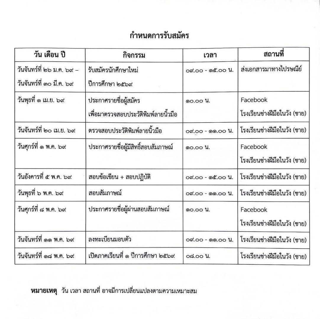 สำนักพระราชวัง เปิดรับสมัครนักศึกษาใหม่โรงเรียนช่างฝีมือในวัง (ชาย) ประจำปีการศึกษา ๒๕๖๙ ตั้งแต่วันที่ ๒๖ ม.ค. – ๓๐ มี.ค. ๒๕๖๙