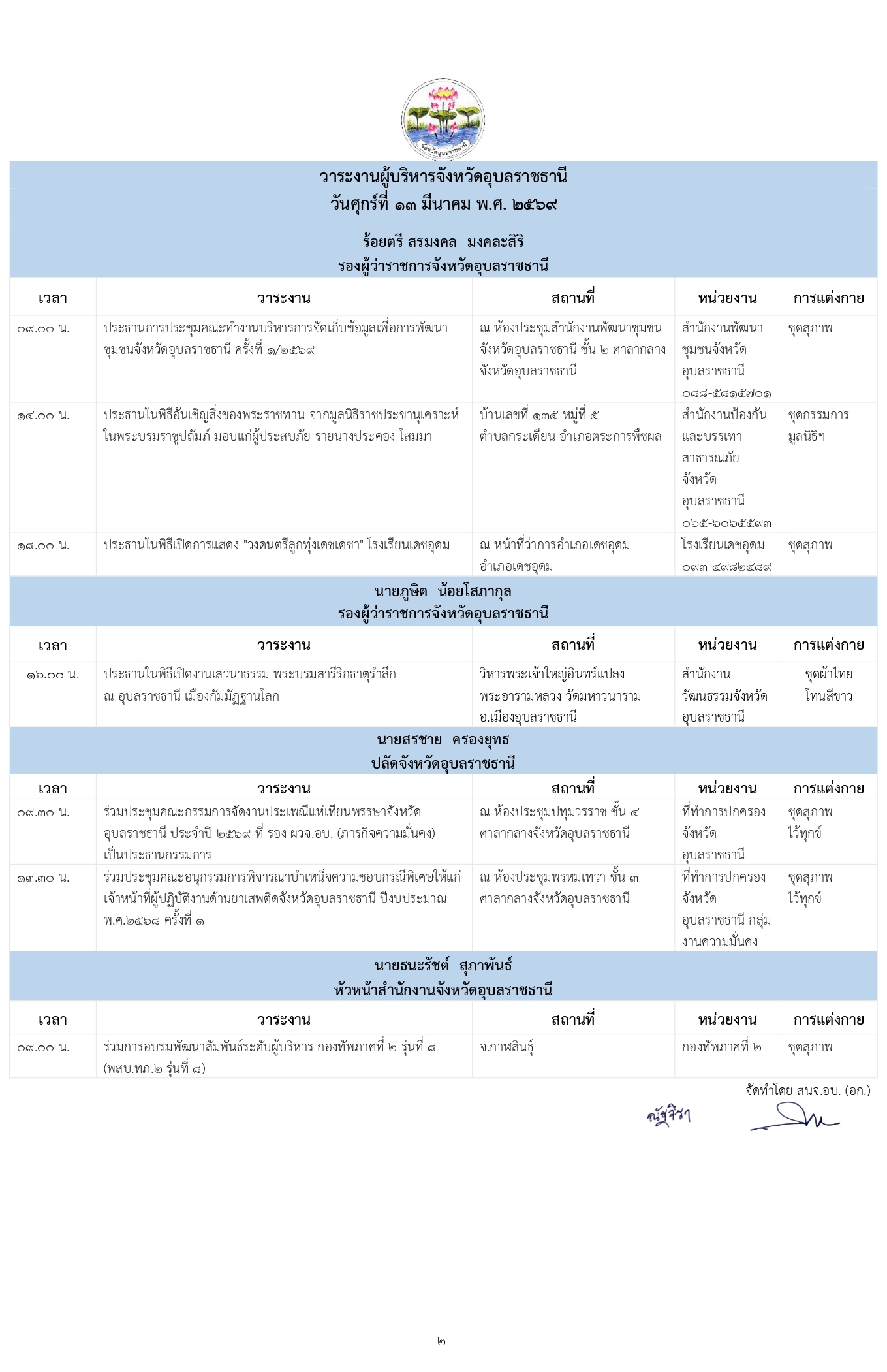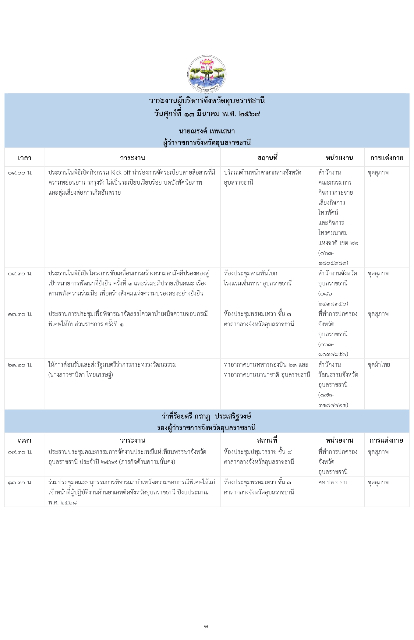 วาระงานผู้บริหารจังหวัดอุบลราชธานี วันศุกร์ที่ 13 มีนาคม 2569
