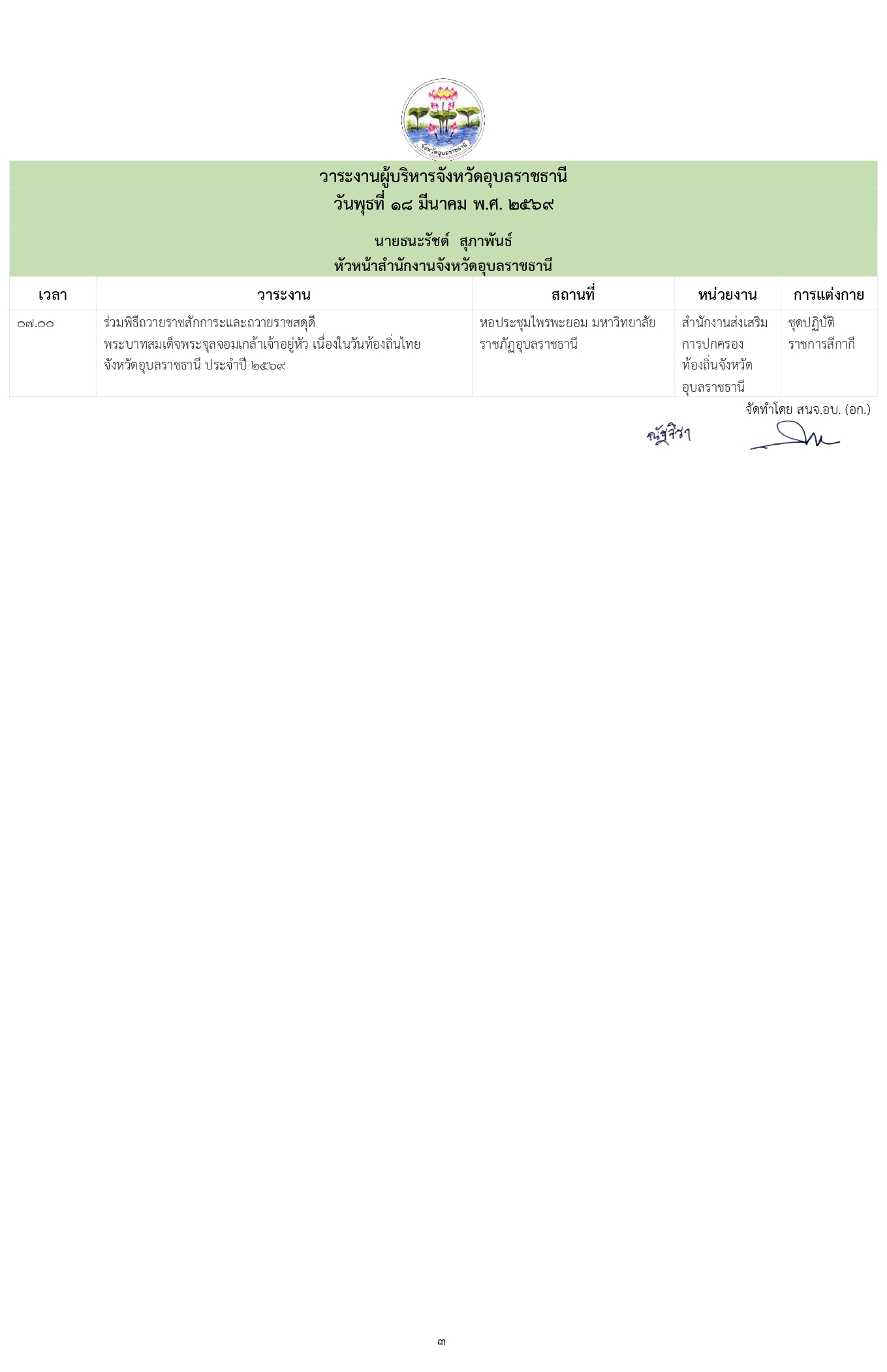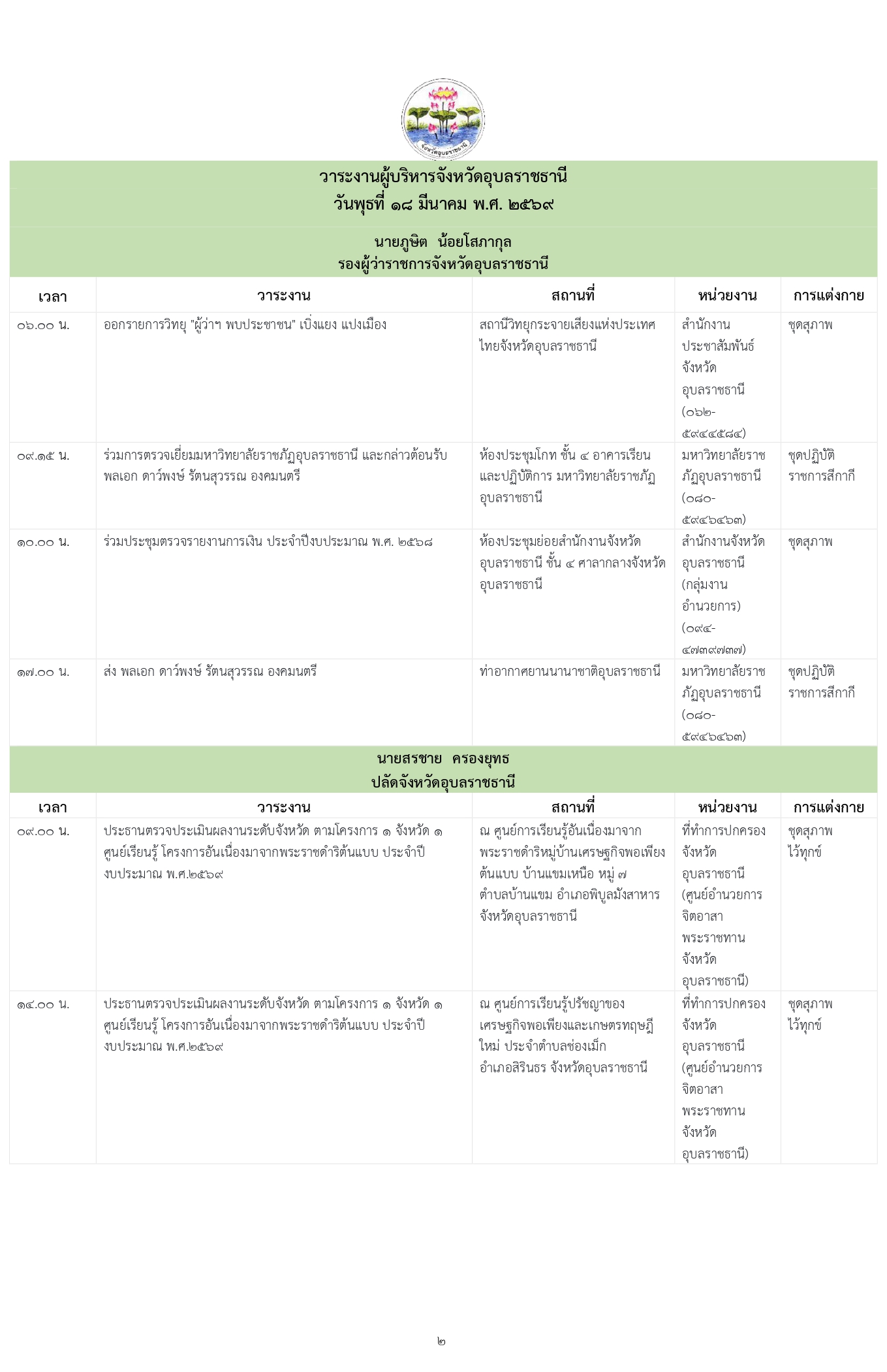 วาระงานผู้บริหารจังหวัดอุบลราชธานี วันพุธที่ 18 มีนาคม 2569