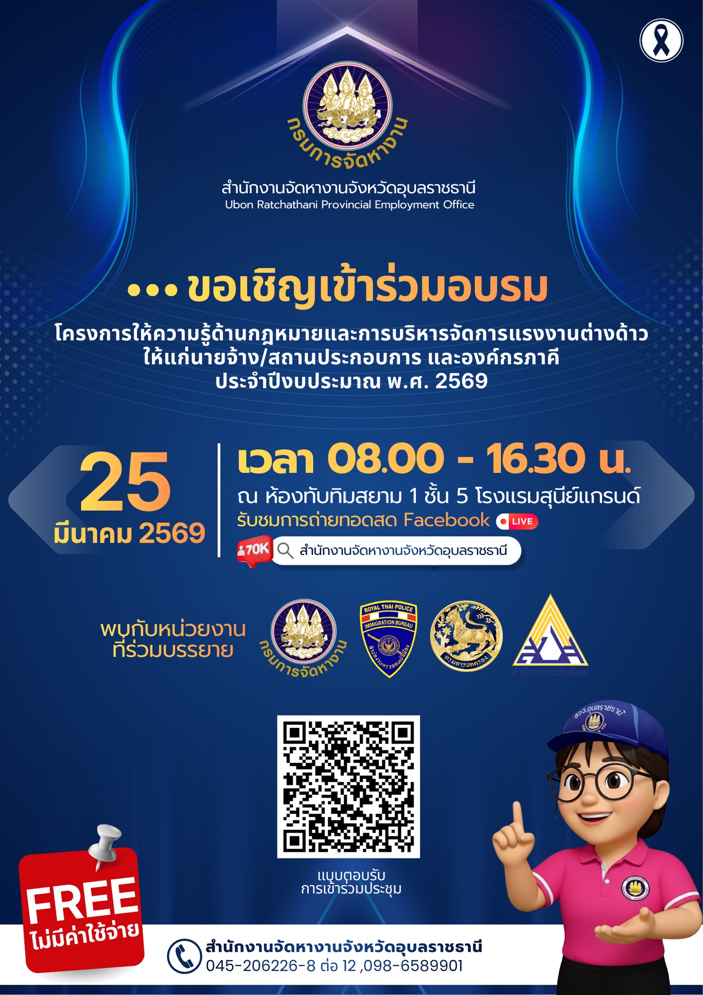 สํานักงานจัดหางานจังหวัดอุบลราชธานี ขอเชิญนายจ้าง/สถานประกอบการ และองค์กรภาคีเครือข่าย เข้าร่วมอบรม โครงการให้ความรู้ดานกฎหมายและการบริหารจัดการแรงงานต่างดาว ให้แก่นายจ้าง/สถานประกอบการ และองคกร์ภาคีเครือข่าย ประจําปีงบประมาณ พ.ศ. 2569 ในวันที่ 25 มีนาคม 2569 เวลา 08.00 – 16.30 น. ณ ห้องทับทิมสยาม 1 ชั้น 5 โรงแรมสุนีย์แกรนด์ จังหวัดอุบลราชธานี