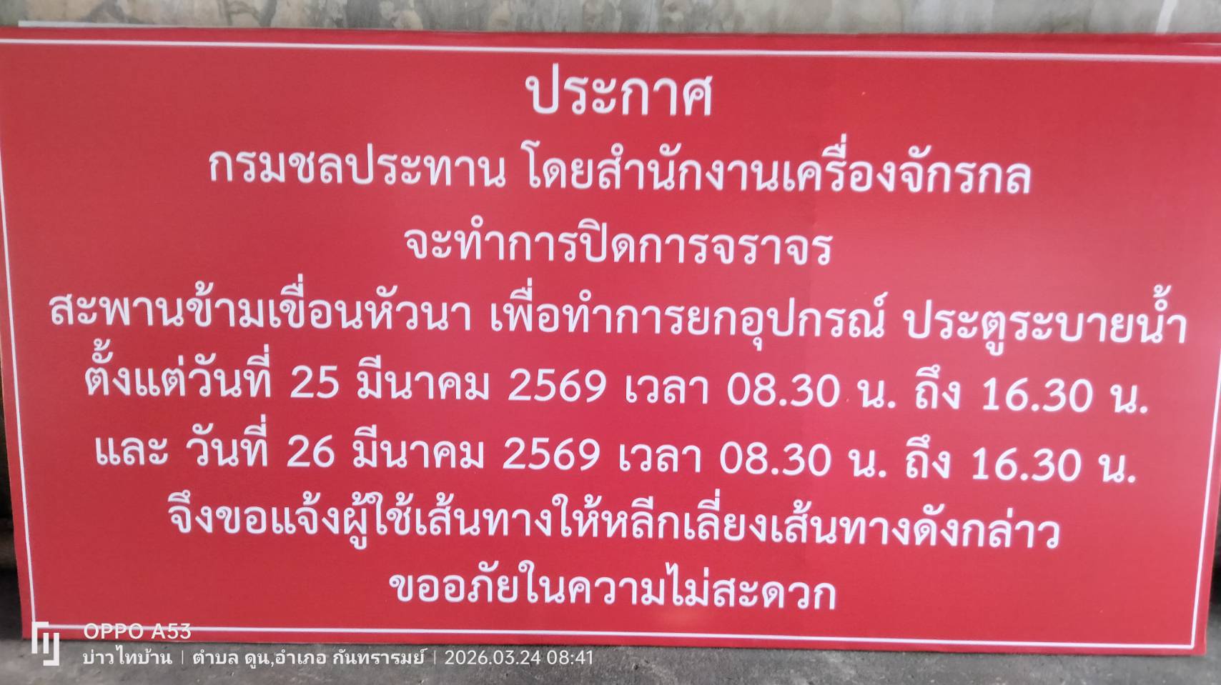 กรมชลประทาน โดยสำนักงานเครื่องจักรกล แจ้งประชาสัมพันธ์ ประกาศ ปิดถนนสะพานข้ามเขื่อนหัวนา วันที่ 25-26 มีนาคม 2569 เวลา 08.30 น - 16.30 น. เพื่อทำการซ่อมประตูระบายน้ำ โดยใช้รถเครนยก และขอแจ้งให้ผู้ใช้เส้นทาง โปรดใช้เส้นทาง บ้านหนองแก้ว-บ้านหนองโอง-บ้านหนองบัวไชยวาน จึงขออภัยในความไม่สะดวก