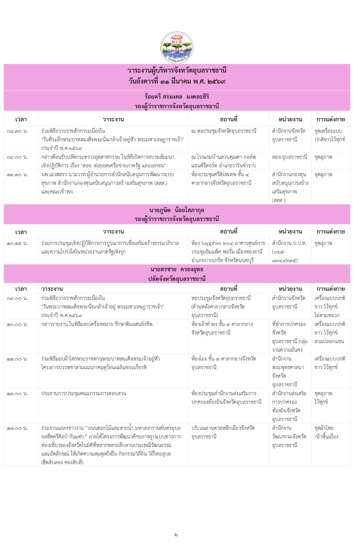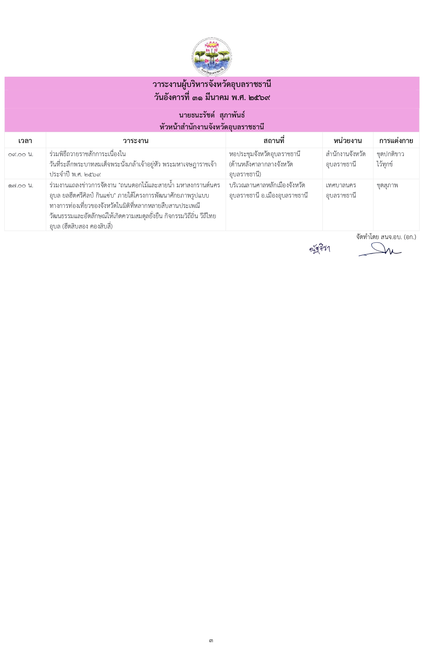 วาระงานผู้บริหารจังหวัดอุบลราชธานี วันอังคารที่ 31 มีนาคม 2569
