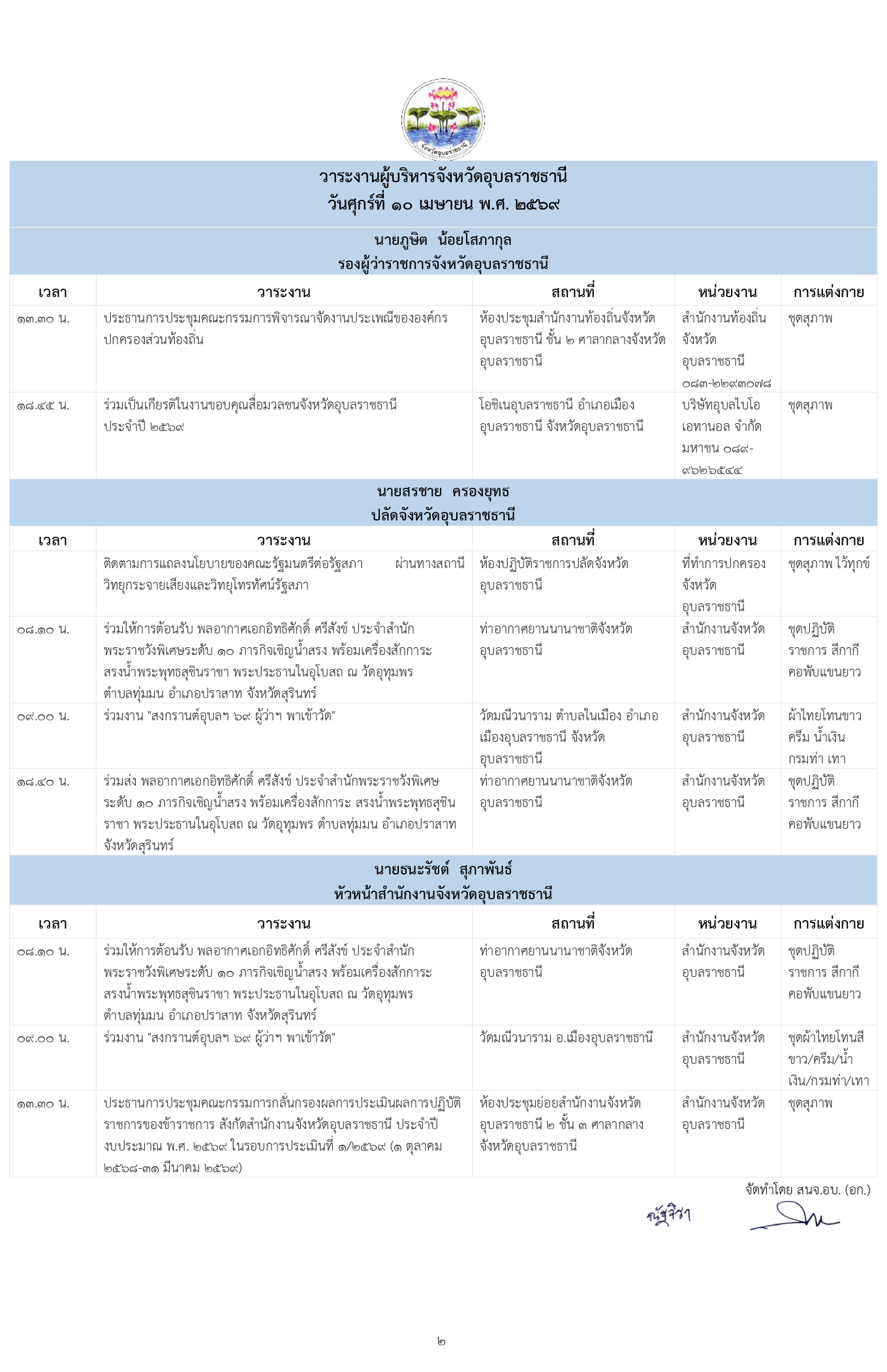วาระผู้บริหารจังหวัดอุบลราชธานี ประจำวันศุกร์ที่ 10 เมษายน 2569