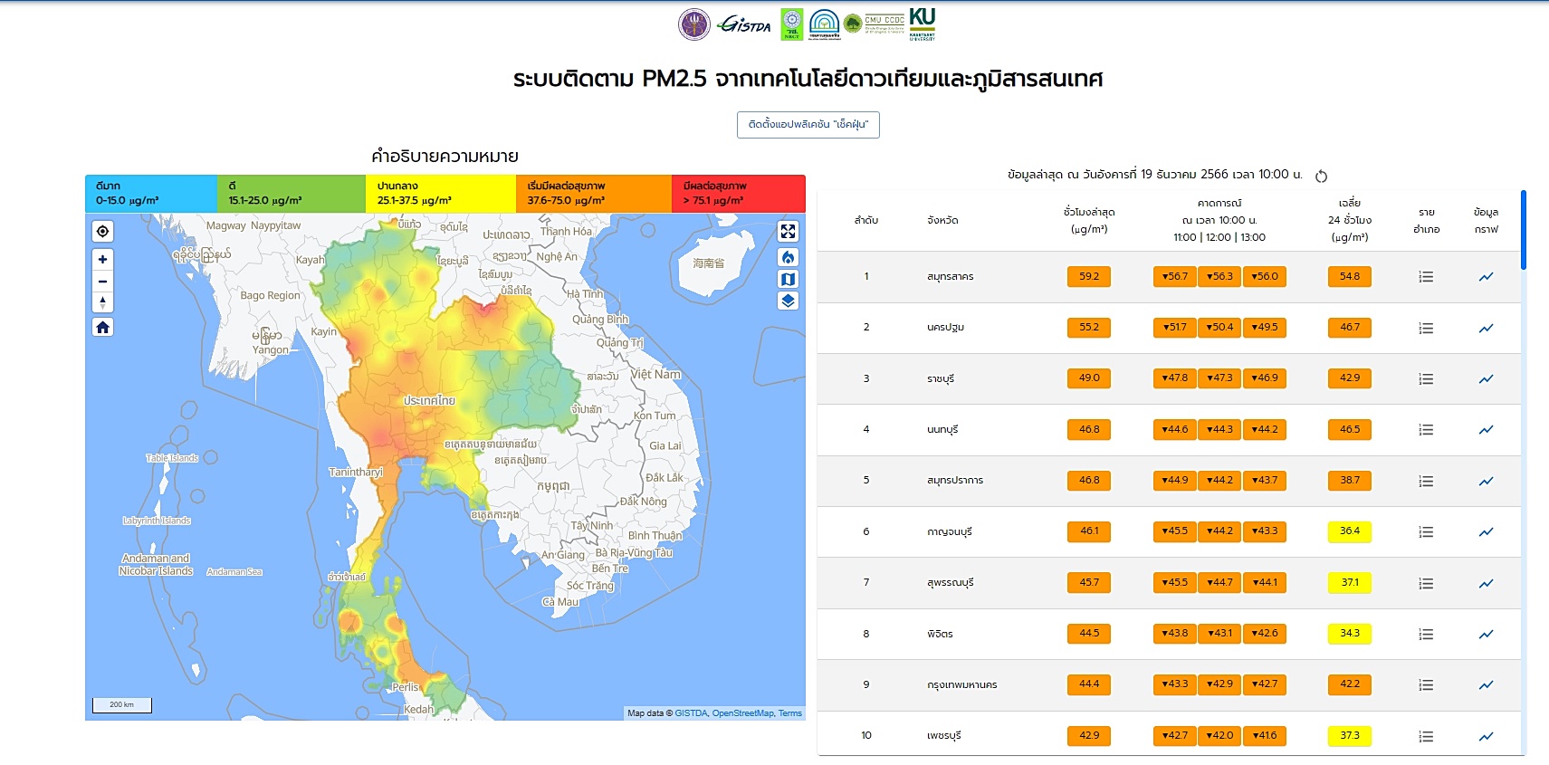 กระทรวงการอุดมศึกษา วิทยาศาสตร์ วิจัยและนวัตกรรม (อว.) โดย GISTDA เกาะติดสถานการณ์ฝุ่น PM 2.5 แบบรายชั่วโมง ด้วยข้อมูลจากดาวเทียมผ่านแอปพลิเคชั่น “เช็คฝุ่น” เมื่อเวลา 10.00 น. ของวันนี้ (19 ธันวาคม 2566) พบว่า ภาพรวมทั้งประเทศยังทรงตัว พบเกินเกณฑ์มาตรฐานในระดับที่เริ่มมีผลกระทบต่อสุขภาพสีส้ม 18 จังหวัด โดยมากสุด 3 อันดับแรกคือ สมุทรสาคร 59.2 ไมโครกรัม นครปฐม 55.2 ไมโครกรัม ราชบุรี 49 ไมโครกรัม ตามลำดับ