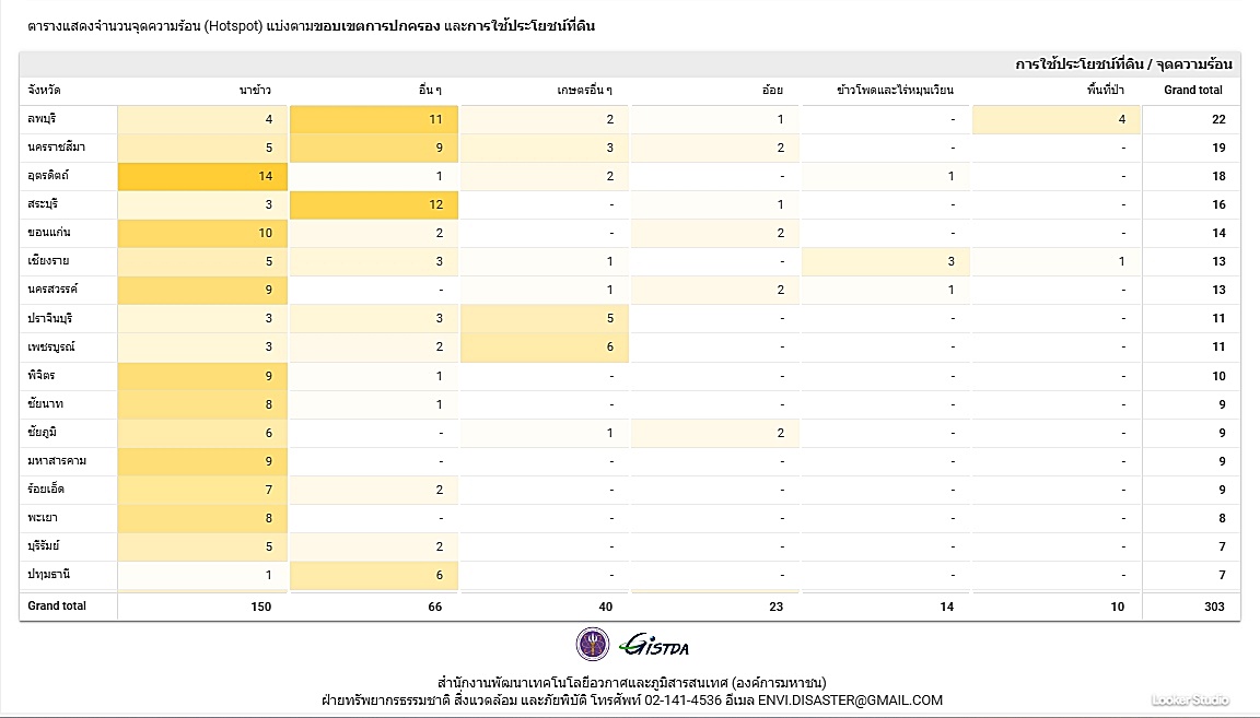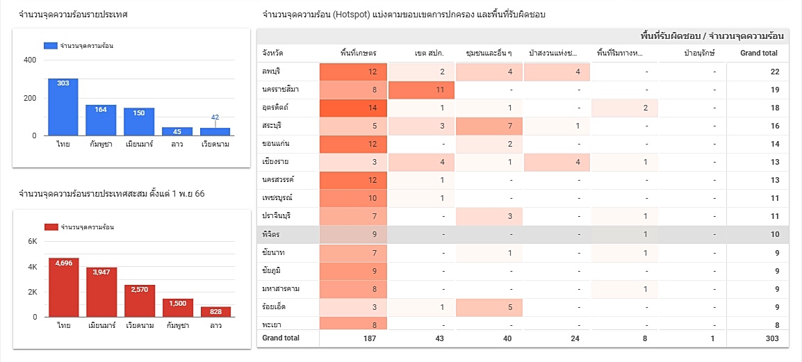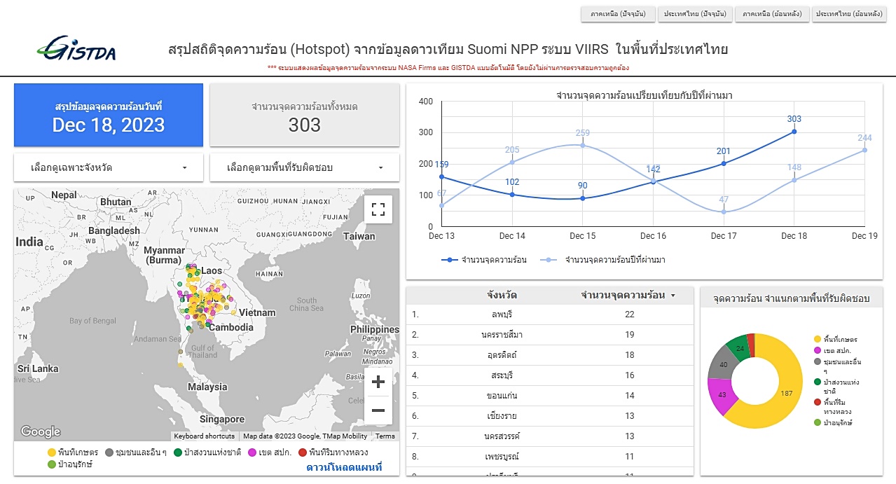 ทั้งนี้ จากข้อมูลจุดความร้อนที่รายงานโดย GISTDA เมื่อวันที่ 18 ธันวาคม 2566 พบจุดความร้อนทั้งประเทศ 303 จุด เพิ่มขึ้นจากเดิม 102 จุด ส่วนใหญ่พบในพื้นที่การเกษตร 187 จุด ตามด้วยพื้นที่ สปก. 43 จุด ชุมชนและอื่นๆ 40 จุด ป่าสงวนแห่งชาติ 24 จุด พื้นที่ริมทางหลวง 8 จุด และป่าอนุรักษ์ 1 จุด จังหวัดที่พบจำนวนจุดความร้อนสูงสุด 3 อันดับแรก คือ ลพบุรี 22 จุด ตามด้วย นครราชสีมา 19 จุด และ อุตรดิตถ์ 18 จุด