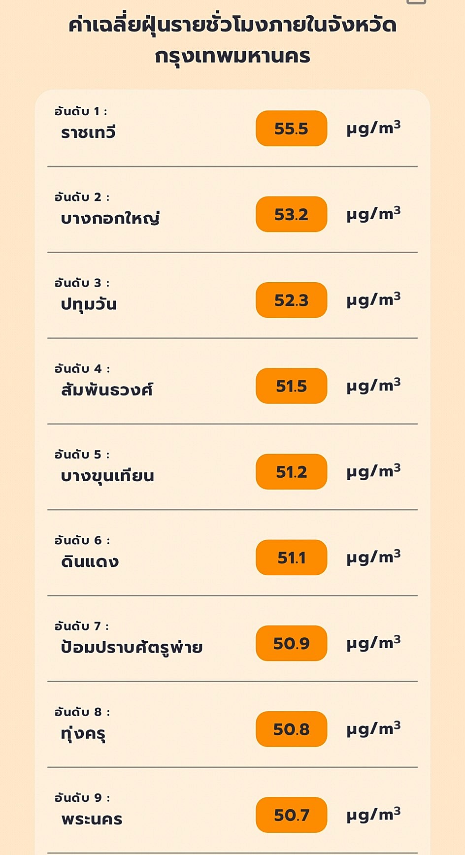 ในขณะที่กรุงเทพมหานคร พบค่าฝุ่น PM2.5 เกินมาตรฐานในระดับสีส้ม 46 เขต สูงสุด 3 ลำดับอยู่ที่ ราชเทวี 55.5 ไมโครกรัม ตามด้วย บางกอกใหญ่ 53.2 ไมโครกรัม และปทุมวัน 52.3 ไมโครกรัมตามลำดับ